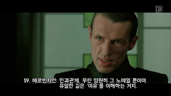 14. 스미스 요원: 외형은 속임수이고, 우리의 존재 이유는 따로 있지. 우리가 여기 있는 건 실은 자유롭지 못해서야. 이유나 목적은 부정할 수 없지. 우린 목적 없이는 존재할 수 없으니깐.
